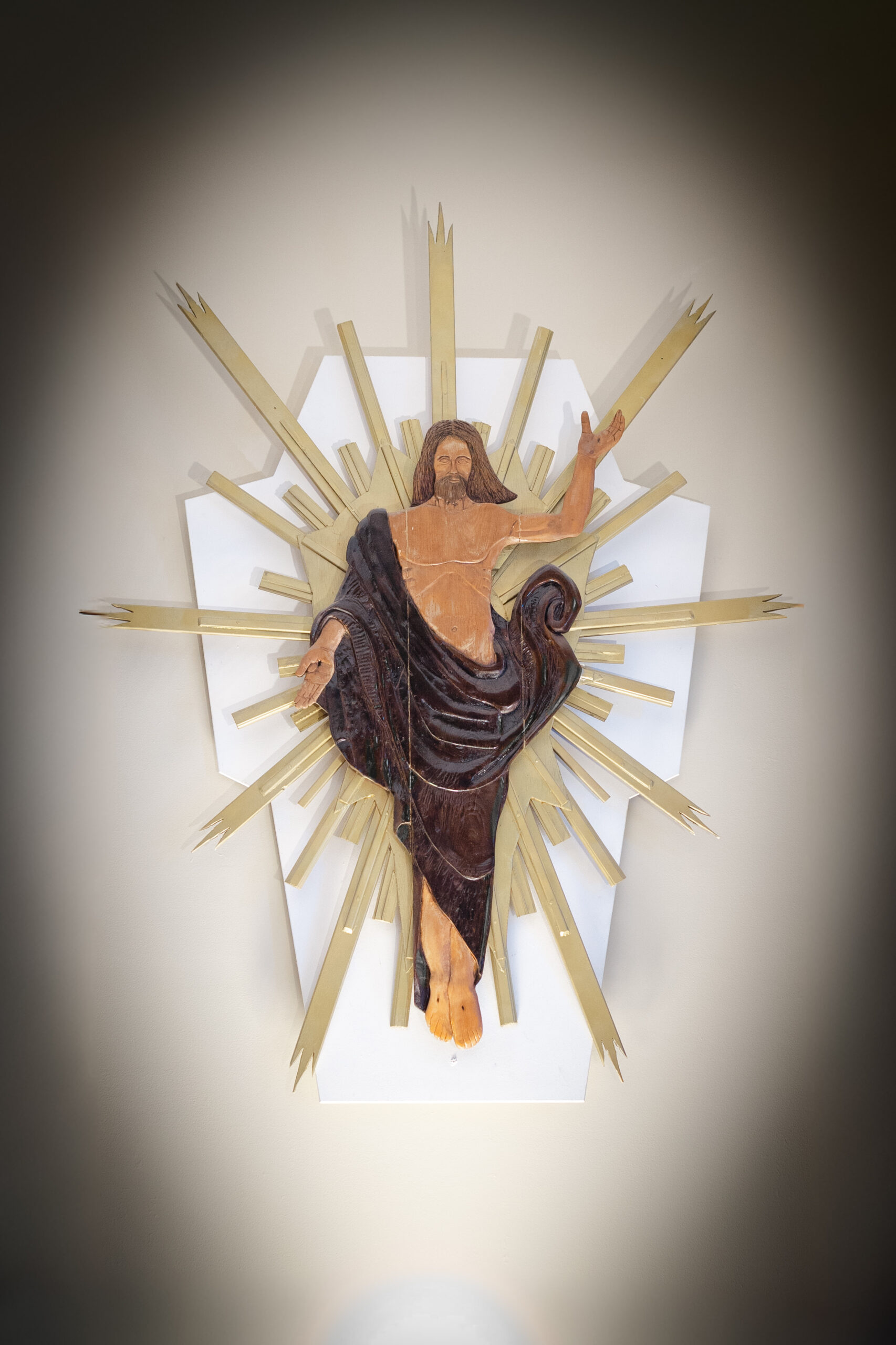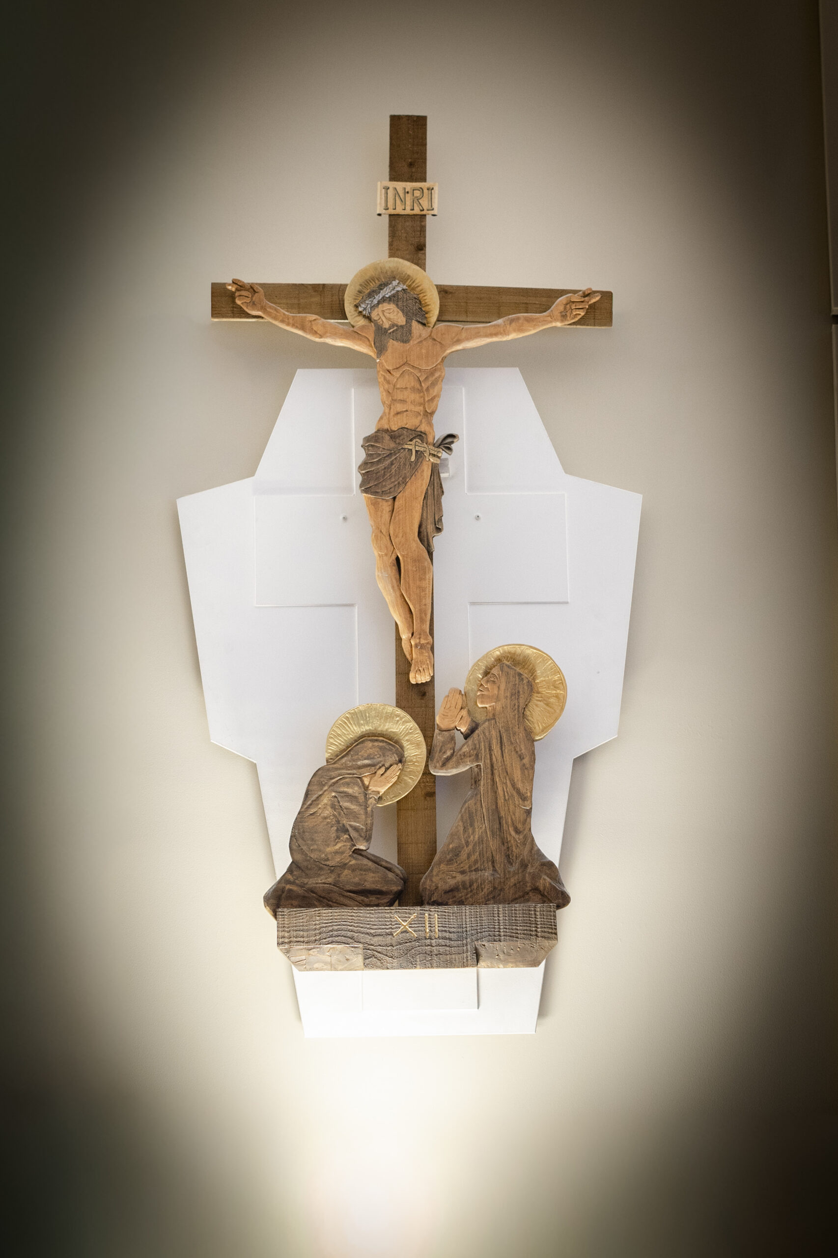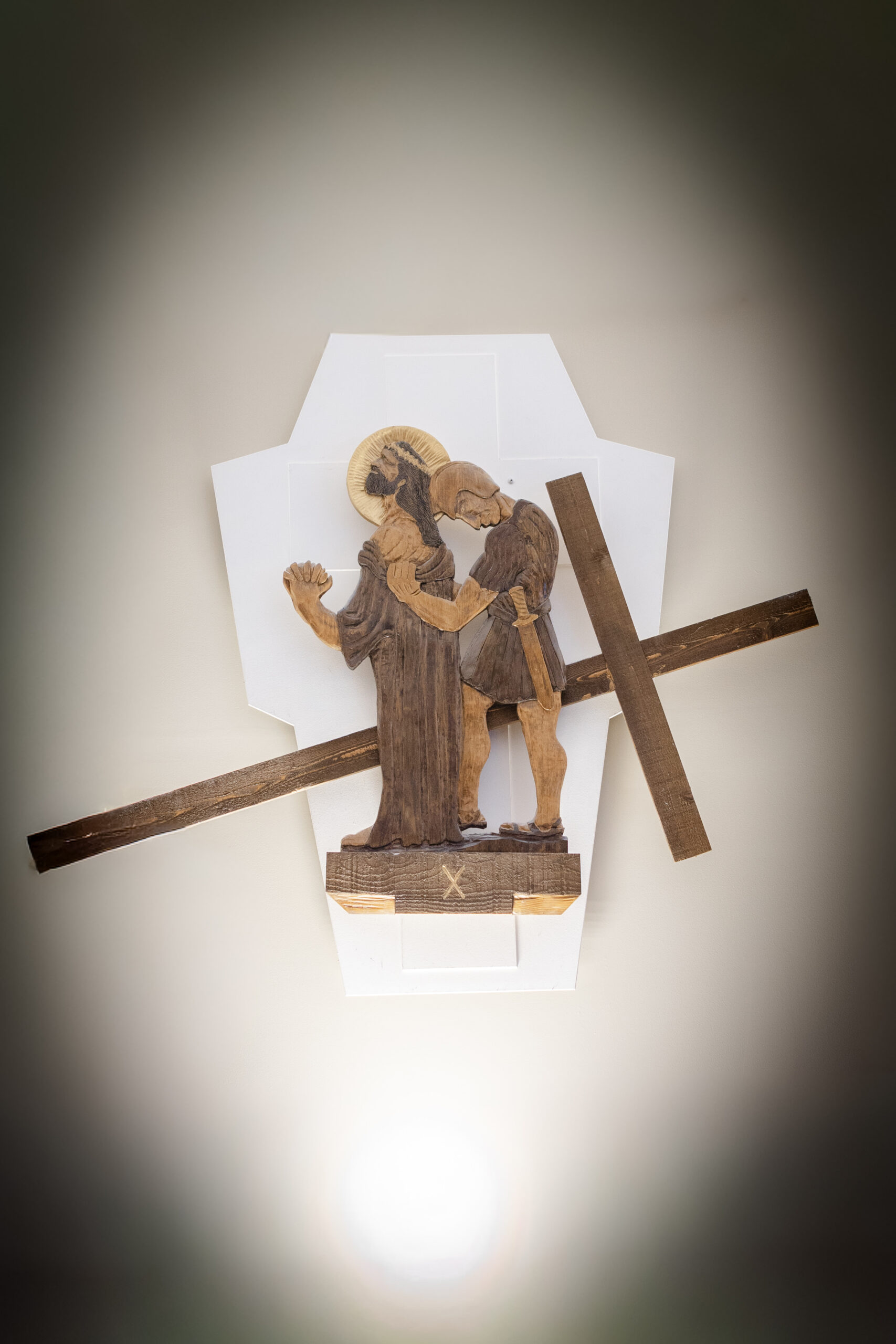 Today Glenn acknowledges, “I had no idea what I was getting into.” He began by carving the Resurrection. “That’s not one of the traditional stations,” he explains, but he saw it as a significant part of his plan. “You’d be surprised,” he says, “how often the Stations you see in churches have Jesus carrying the cross from right to left. So, when you’re praying them, you’re going against the flow. I wanted Jesus to be going left to right, and towards the Resurrection.”