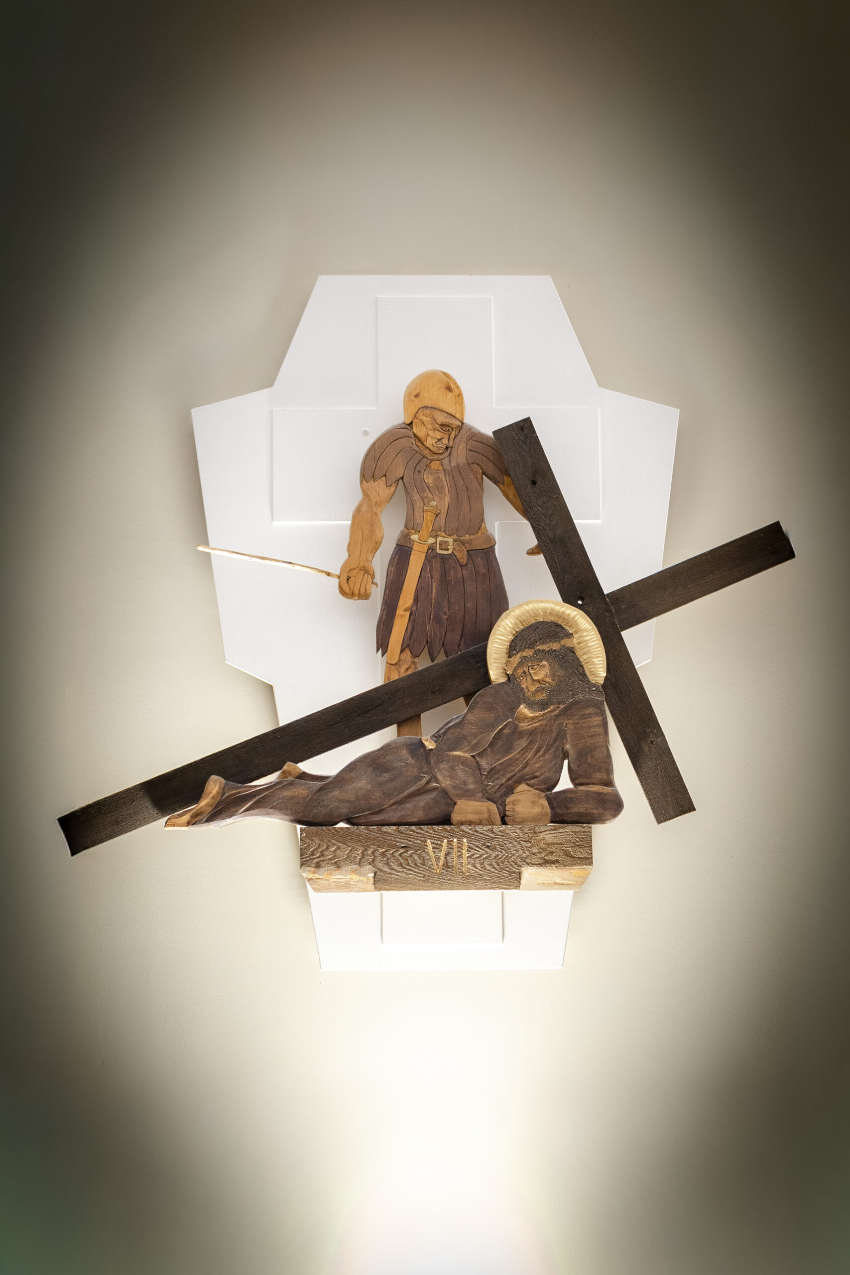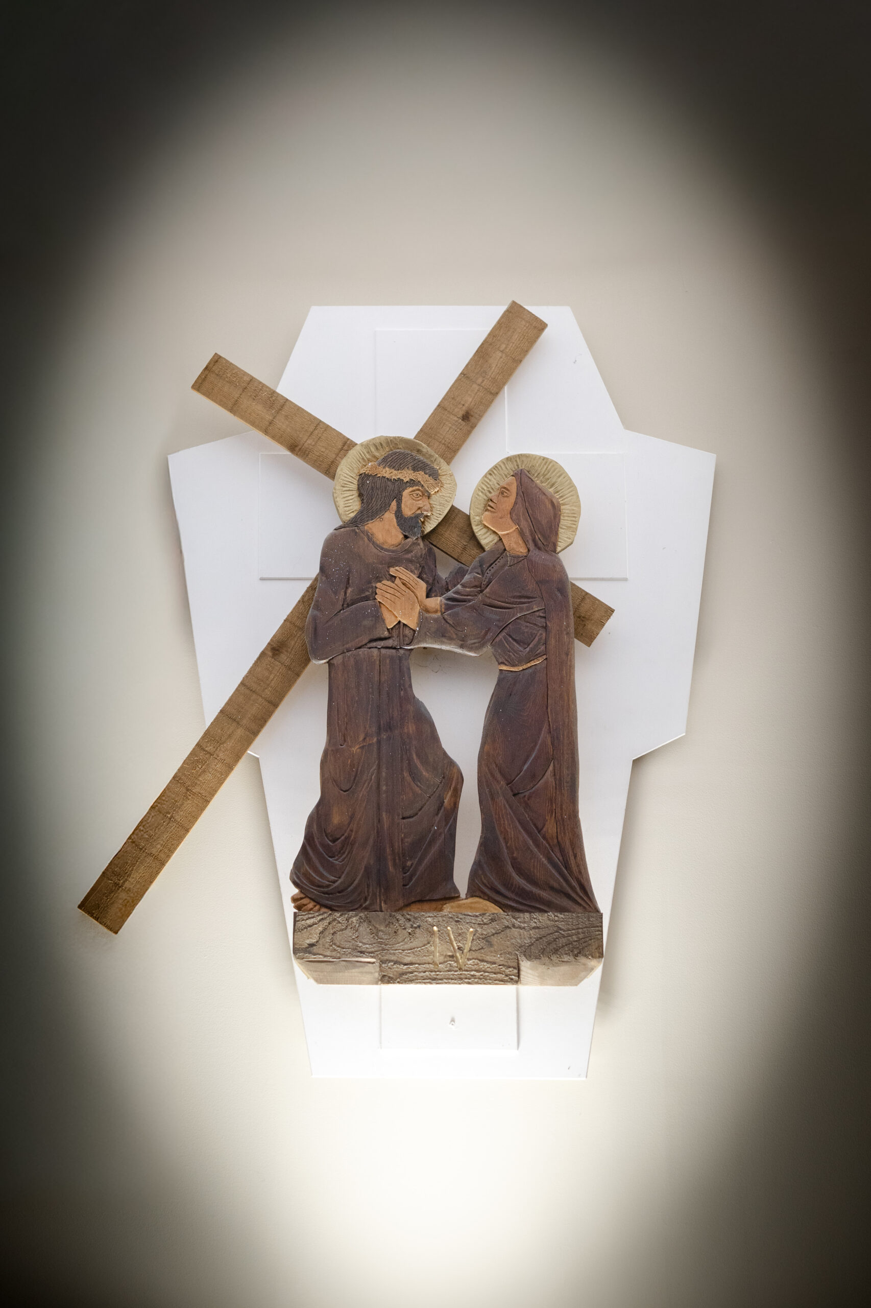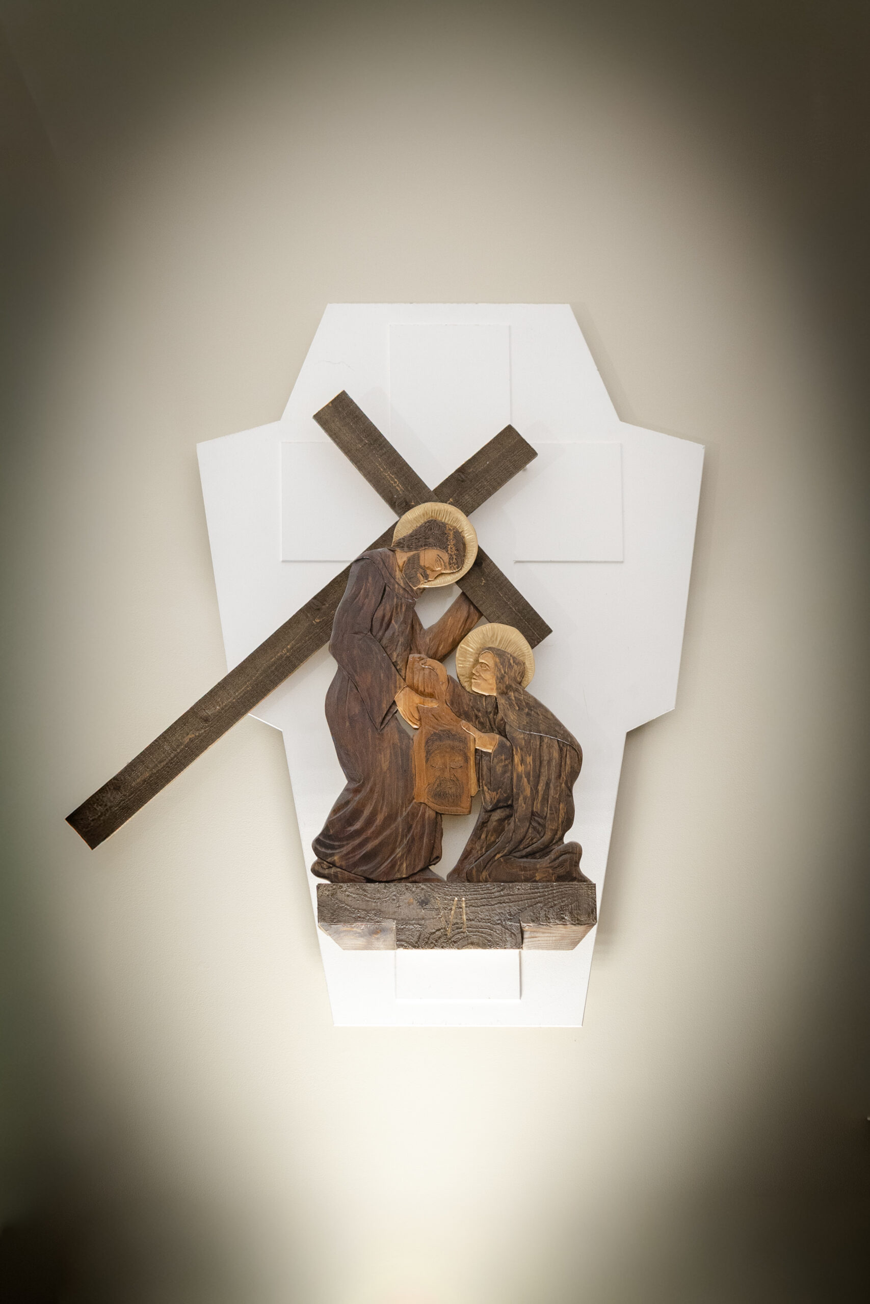 And the emotions evoked by the pain inflicted on our Savior were always just beneath the surface. Just beneath, until one Sunday when Glenn and Pat (his wife) were assembling the eleventh Station: Jesus is nailed to the Cross. “I had carved Christ and the cross separately,” Glenn recalls. “We had it all measured and up on the work bench, and I had found some square-headed iron nails to fix the body to the cross. But as I put the nails into the hands of the figure of Jesus I suddenly felt this surge of emotion right in my solar plexus and I had to pause. Pat noticed right away.” “He just turned ashen white,” Pat remembers. “It was incredibly emotional. Neither one of us could say a word. I wouldn’t want to go through that again.” “Any work of art includes pain,” Father Walsh has commented. “And a lot of suffering went into the work here. But Glenn kept going. It was a work of love.”